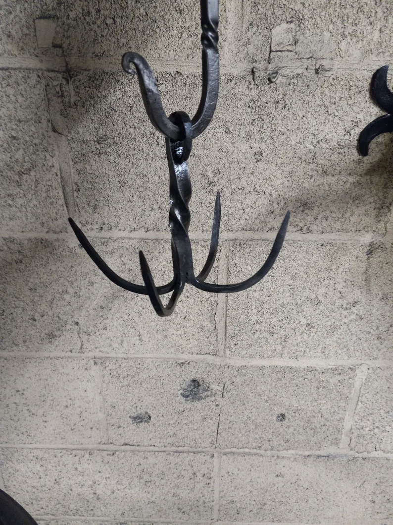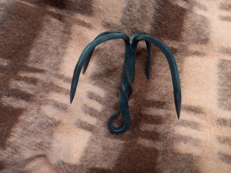 This is a forged meat hook which was a simple way of roasting delicious animal flesh during colonial america. Traditionally this was hung over the fire with the idea that you could roast multiple morsels at a time or hang a larger piece. Old recipes during the days of George Washington typically had the roast stuffed with herbs and spices, banded with twine and the drippings were collected when possible to baste the meat.