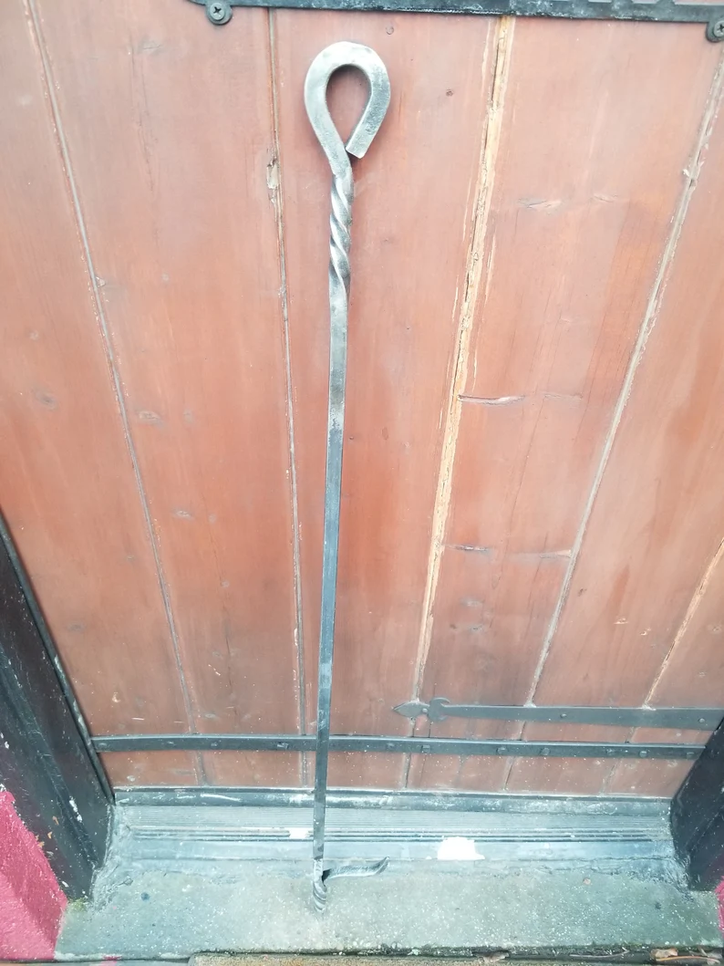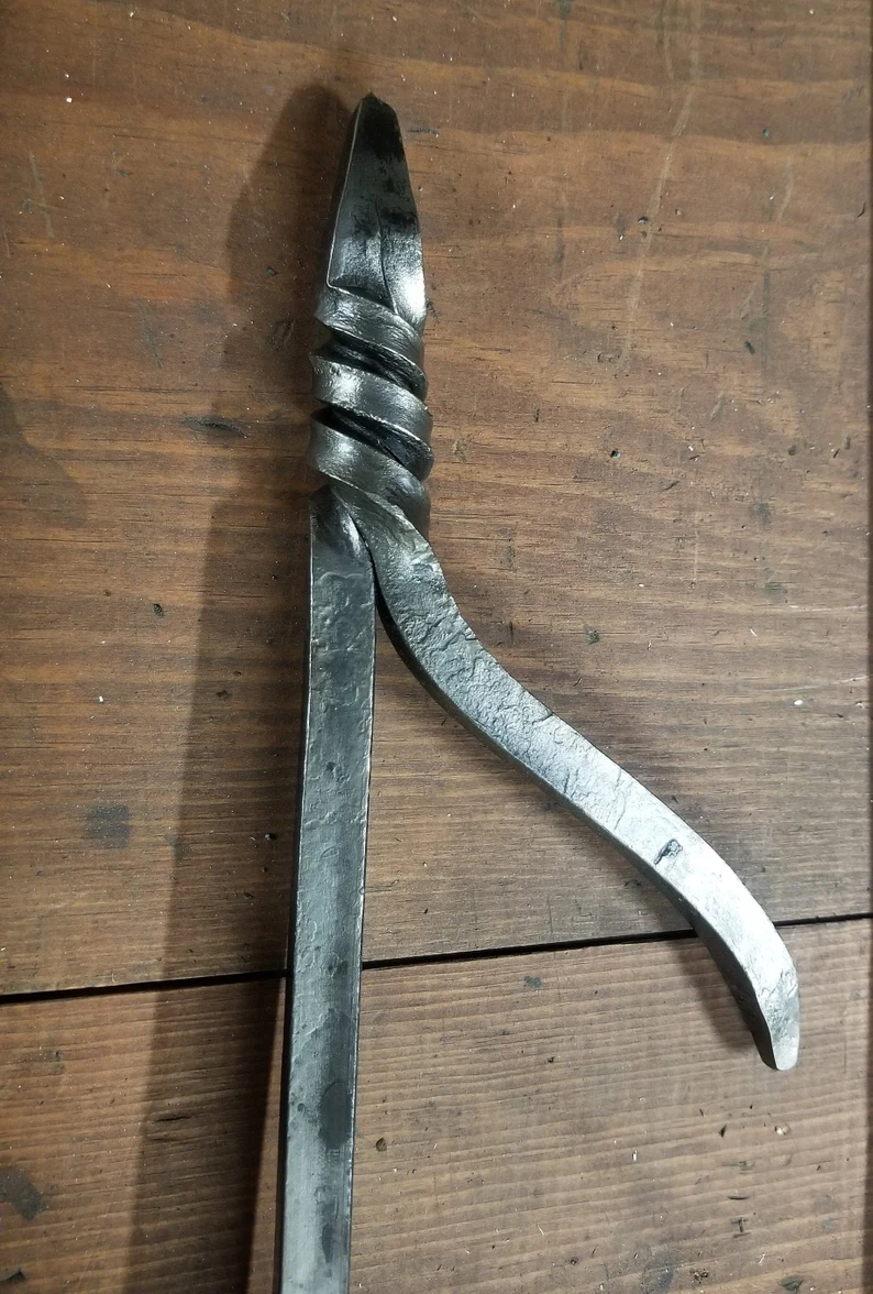 Hand forged fire poker. Made from half inch thick solid steel. These are a bit heavy but are built to last, will not bend or flex when dealing with the most stubborn logs. The barb is oversized for added control dealing with odd shaped firewood. The handle is longer at around 44 inches. just shy of 4 feet so you can keep a comfortable distance from a roaring fire but not overly long and unwieldy. Use it outdoors to tame your bon fire or large fire pit. durable enough to be left outdoors. Now 5ft version also available! J hook also available!